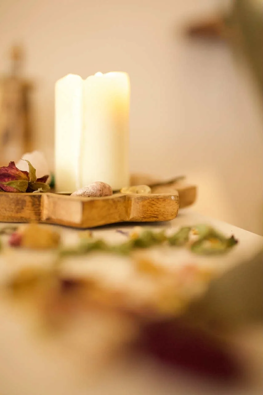 White candles on a wooden tray, surrounded by decorative stones and dried flowers, with blurred colorful flowers in the foreground.