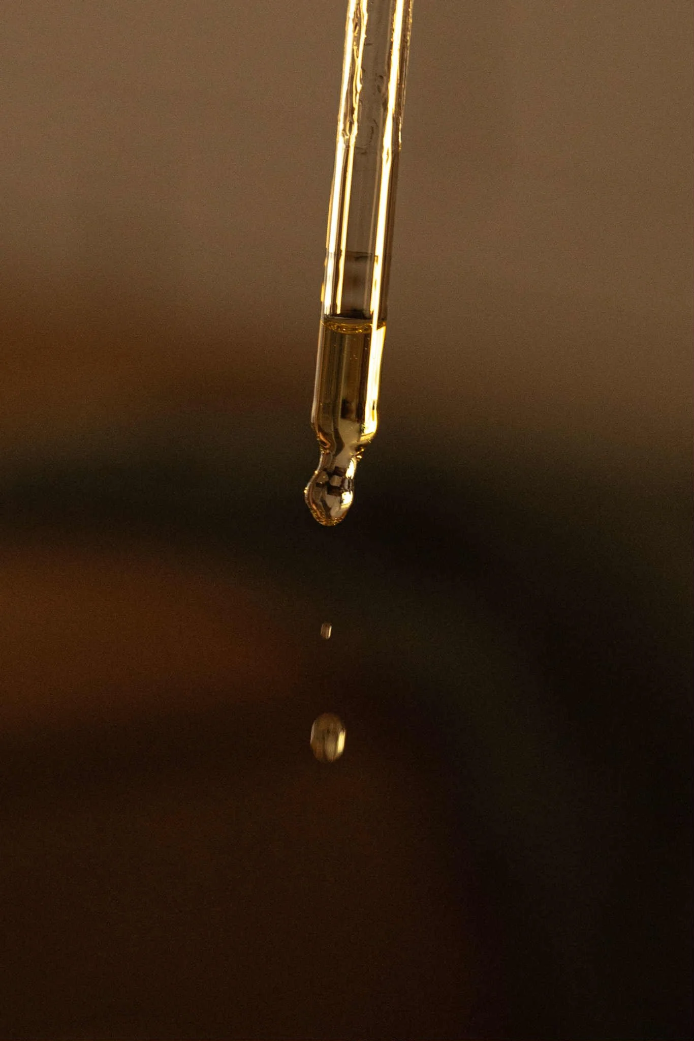 Close-up of a dropper with a clear liquid, with a droplet falling from it against a dark background.