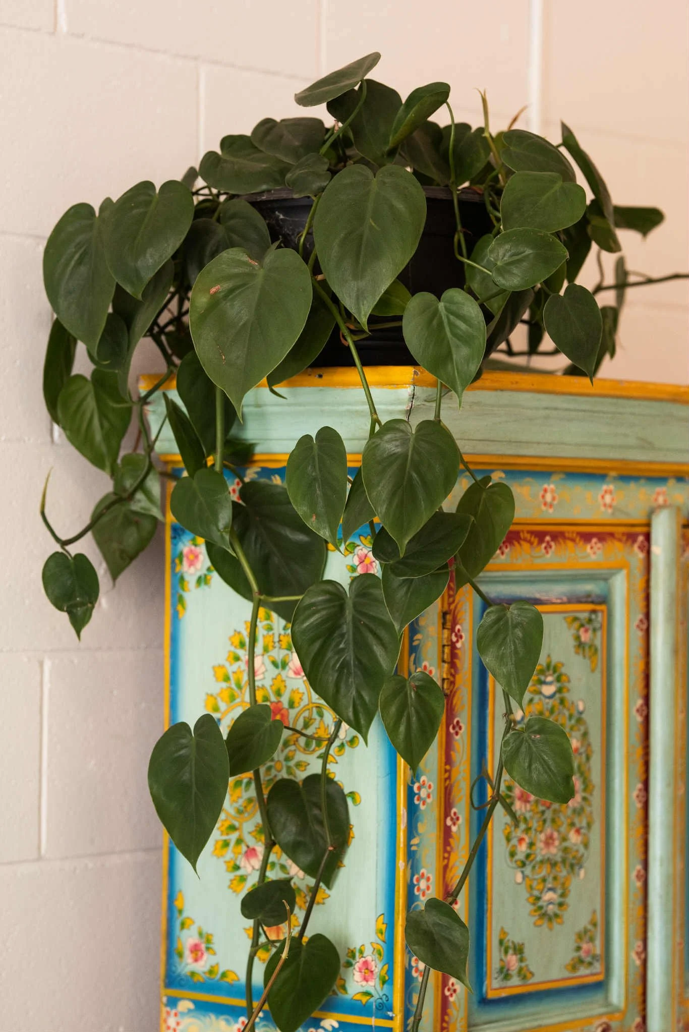 A potted trailing heartleaf philodendron plant on a colorful, hand-painted wooden cabinet against a light-colored wall.