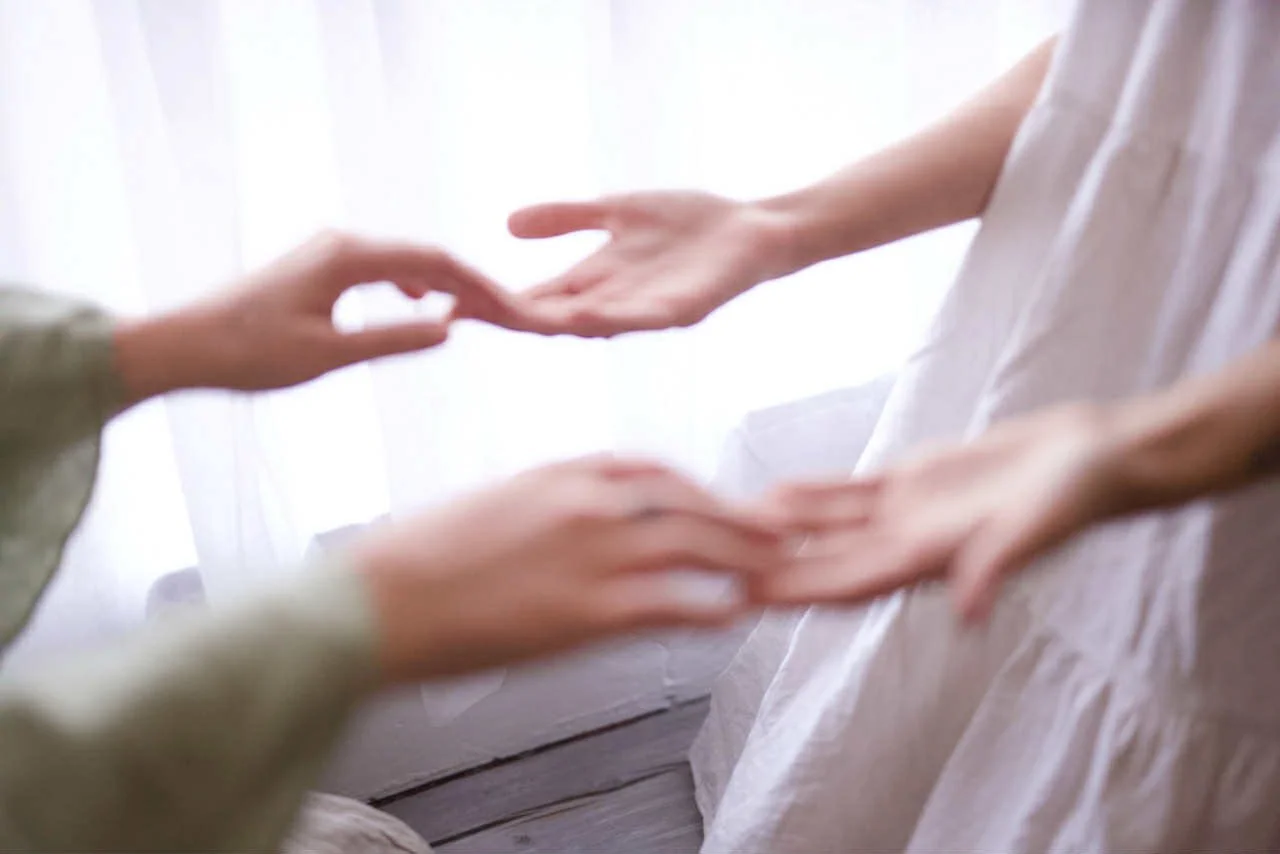 Two people holding hands with a gentle touch in a bright, softly lit room.
