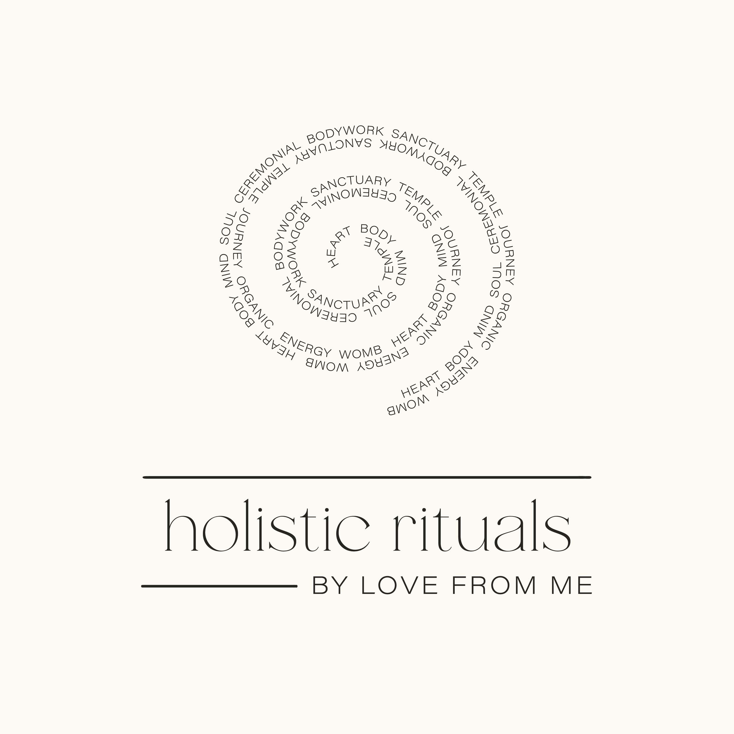 Cover of a book titled "Holistic Rituals by Love From Me" with a spiral pattern of words related to body, soul, energy, sanctuary, temple, and sacred elements above the title.